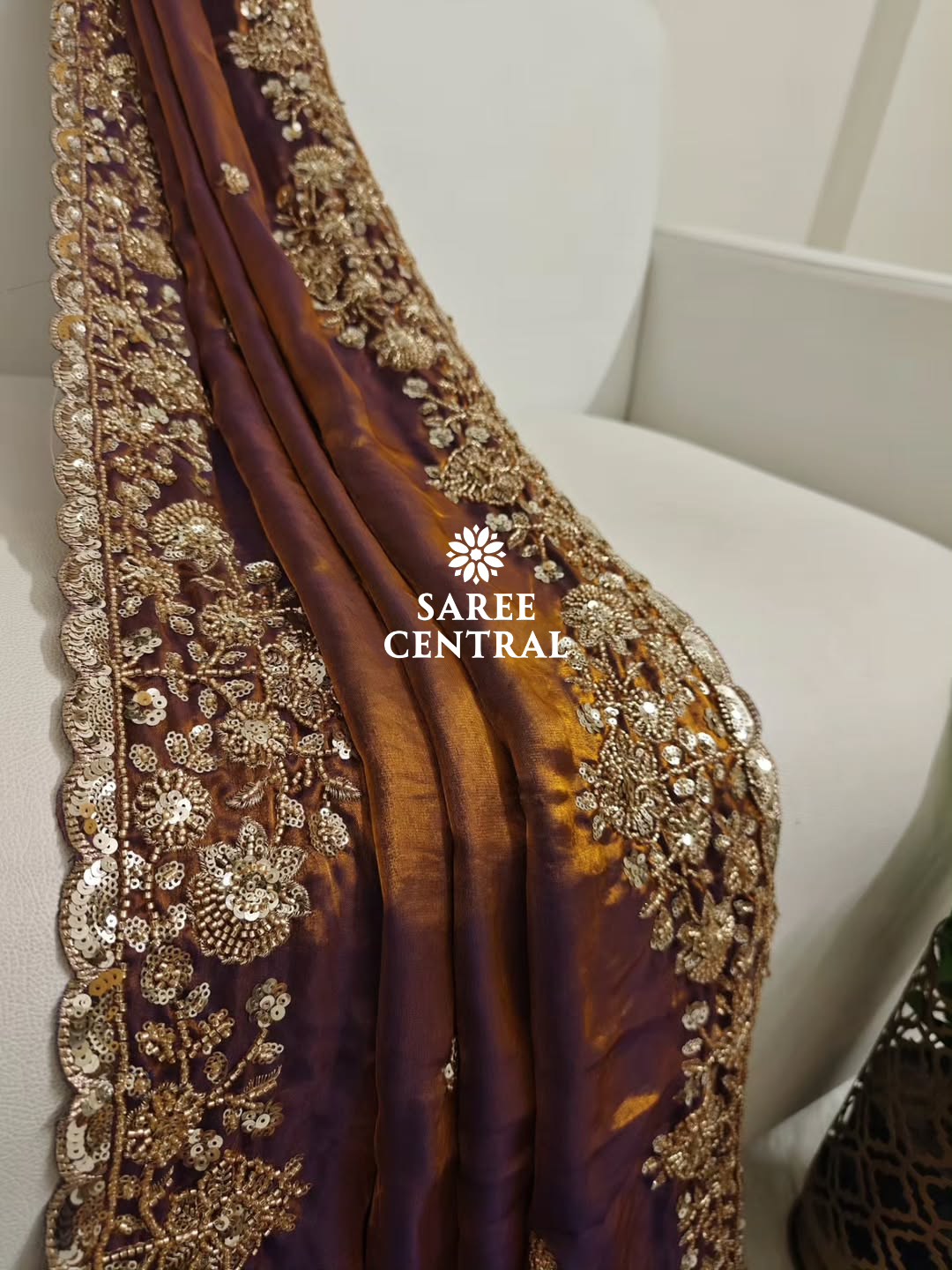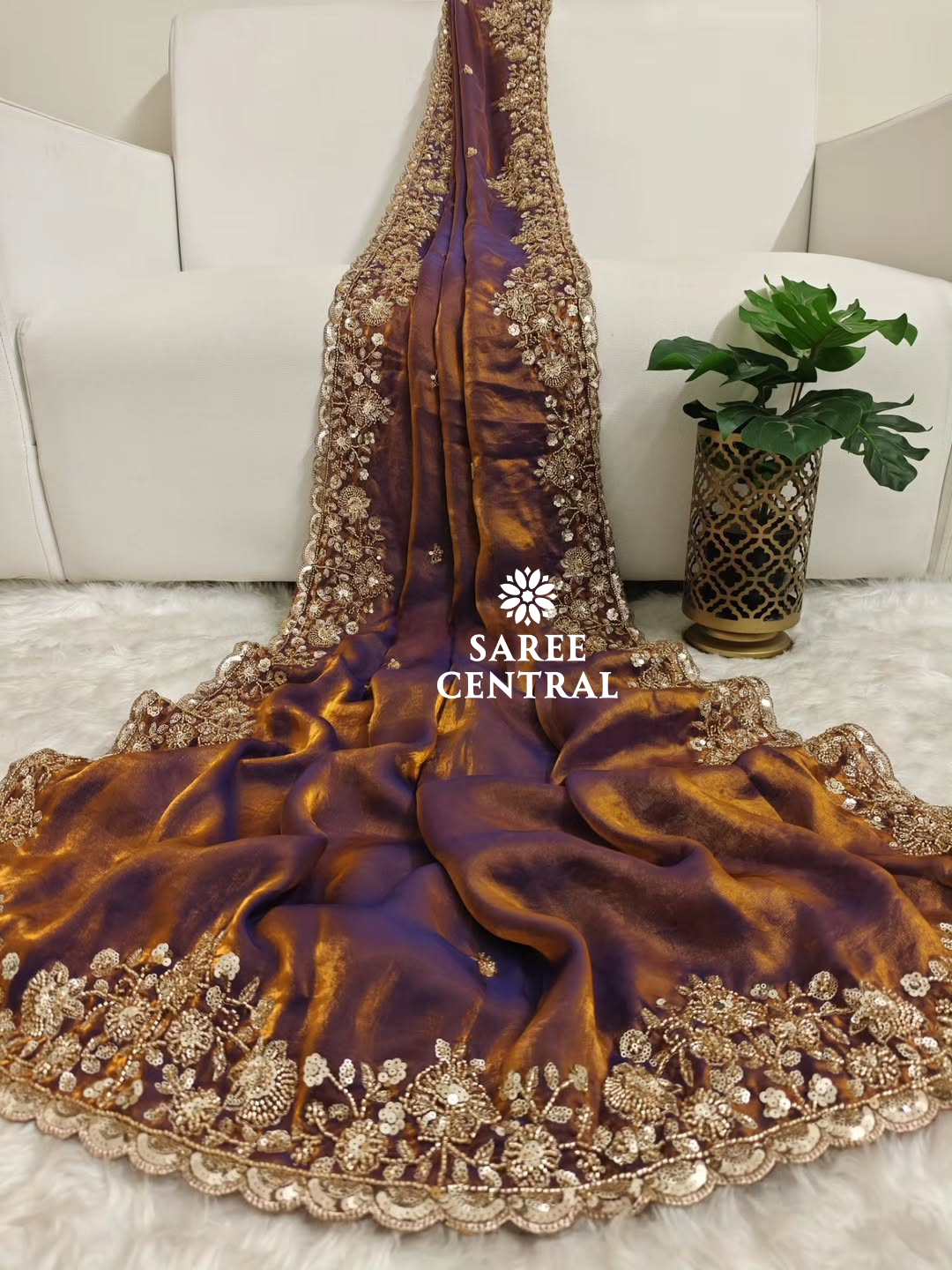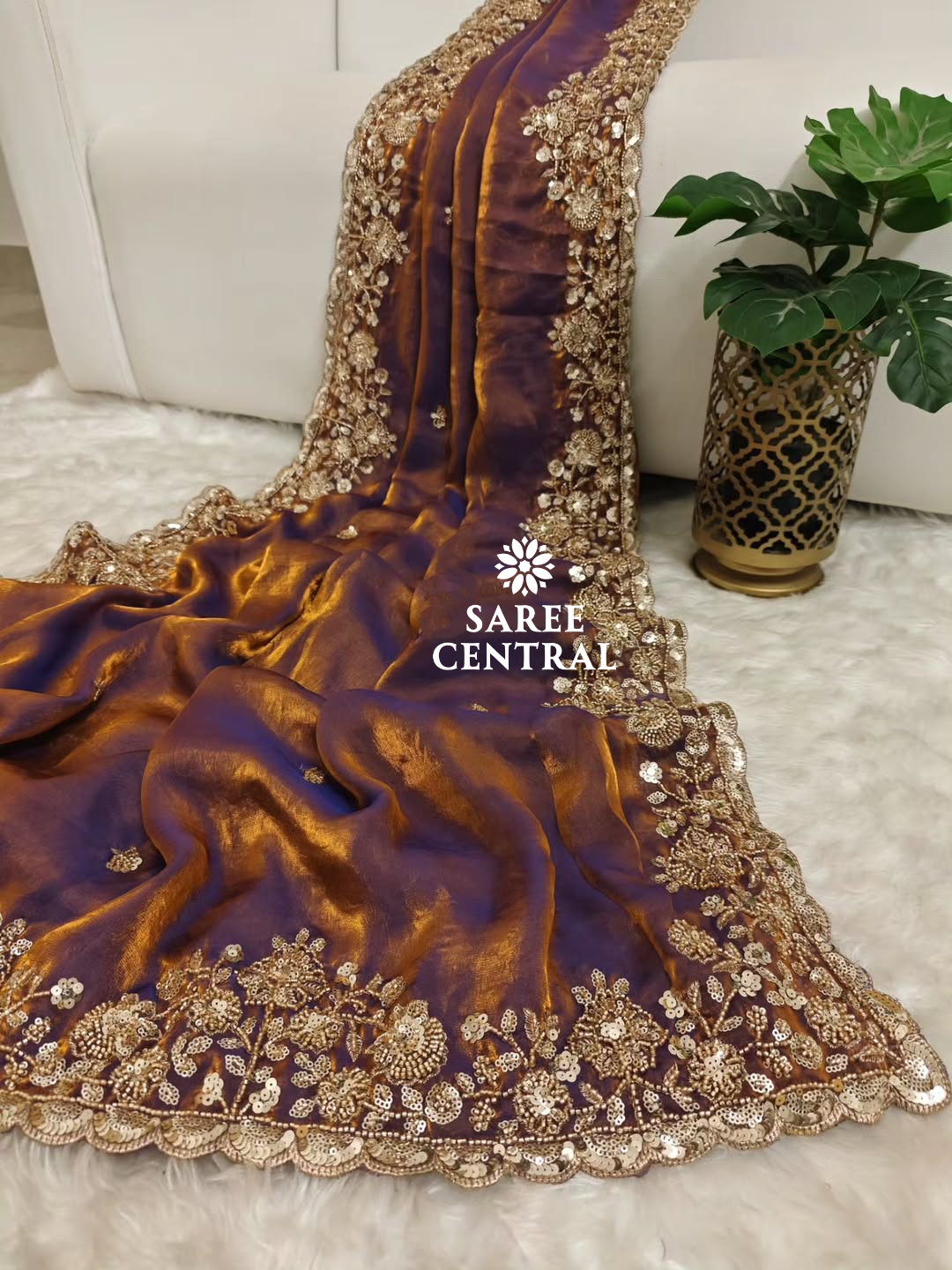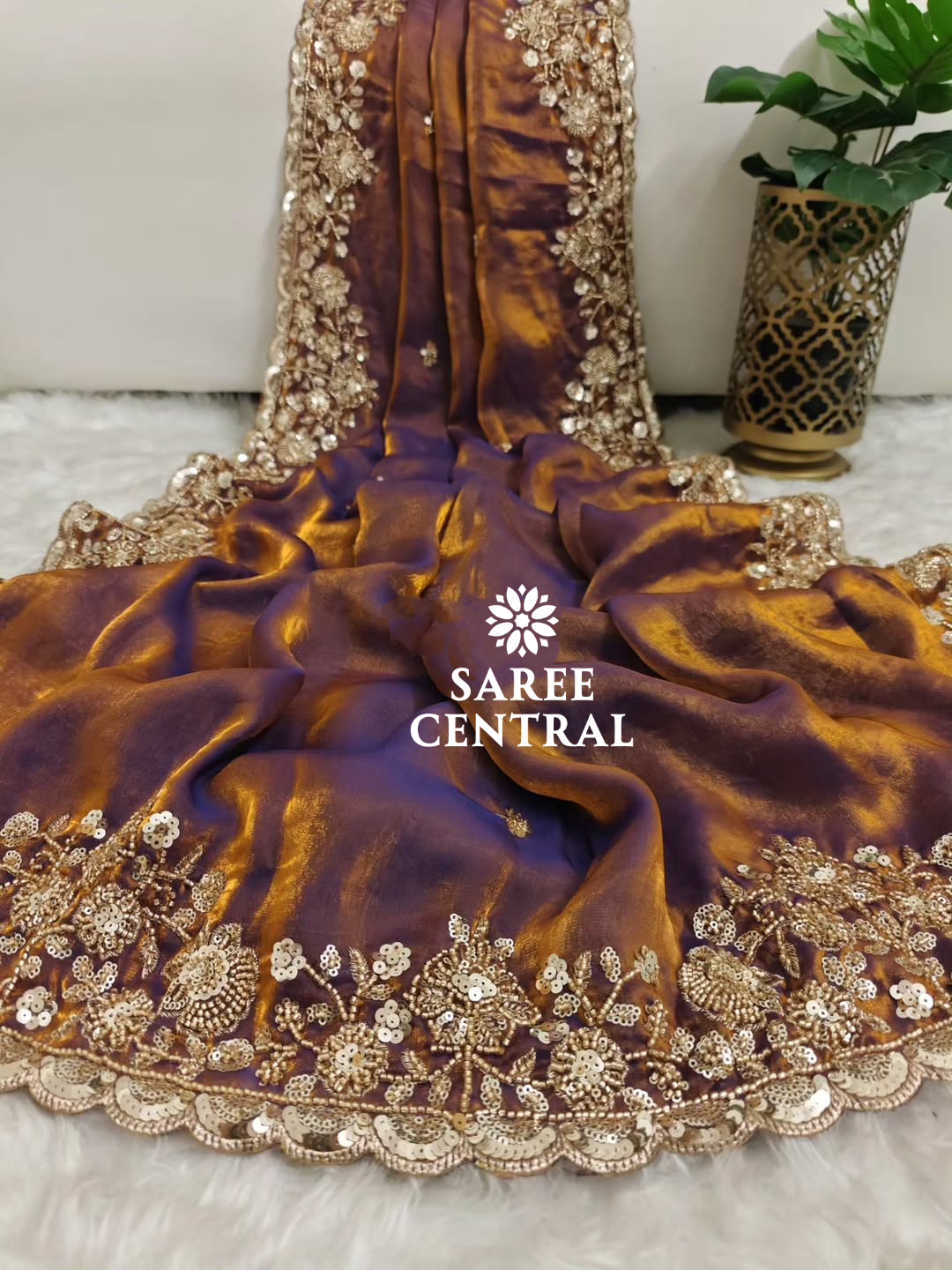 Copper Gold Cutdana Beads, Sequins Embroidered Partywear Saree (SC55521)