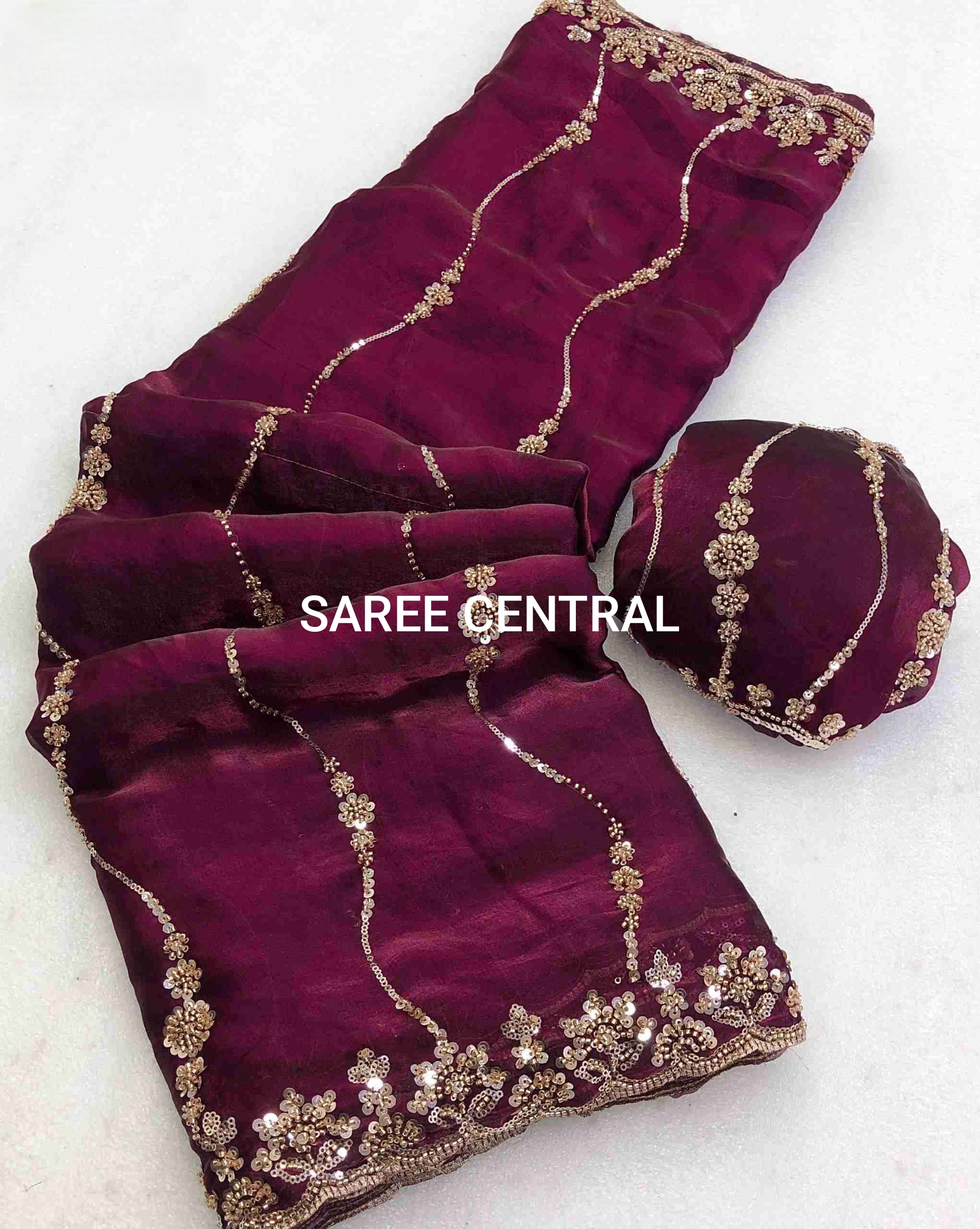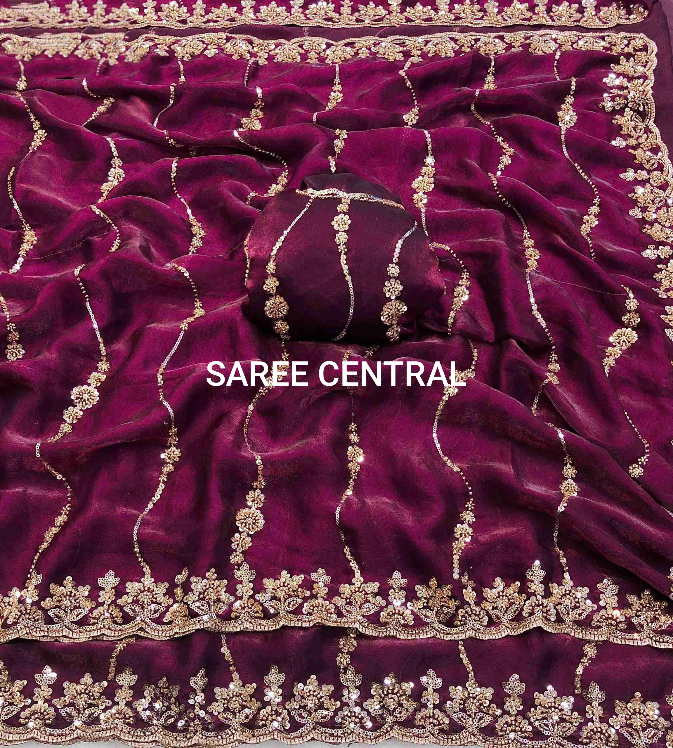 Magenta Satin Silk Saree with Gold Beads, Cutdana, Sequins Embroidery Work (SC88113)