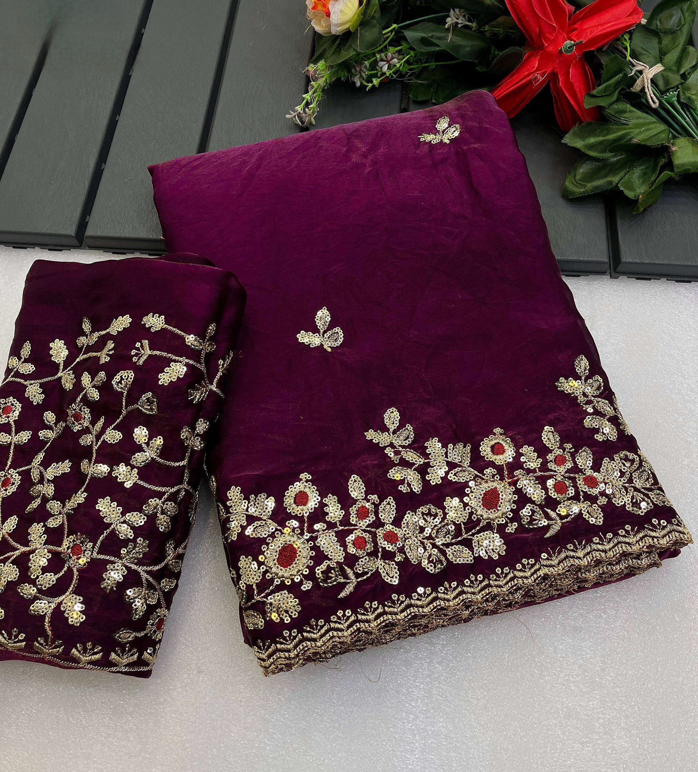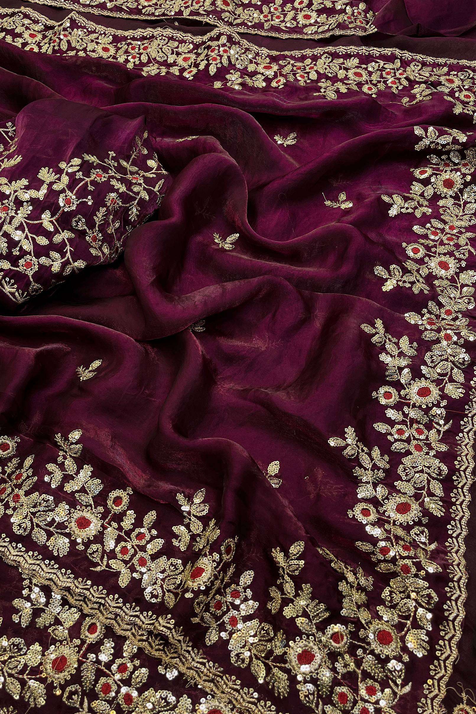 Magenta Wine Tissue Silk Gold Sequins Embroidery Saree (SC35323)