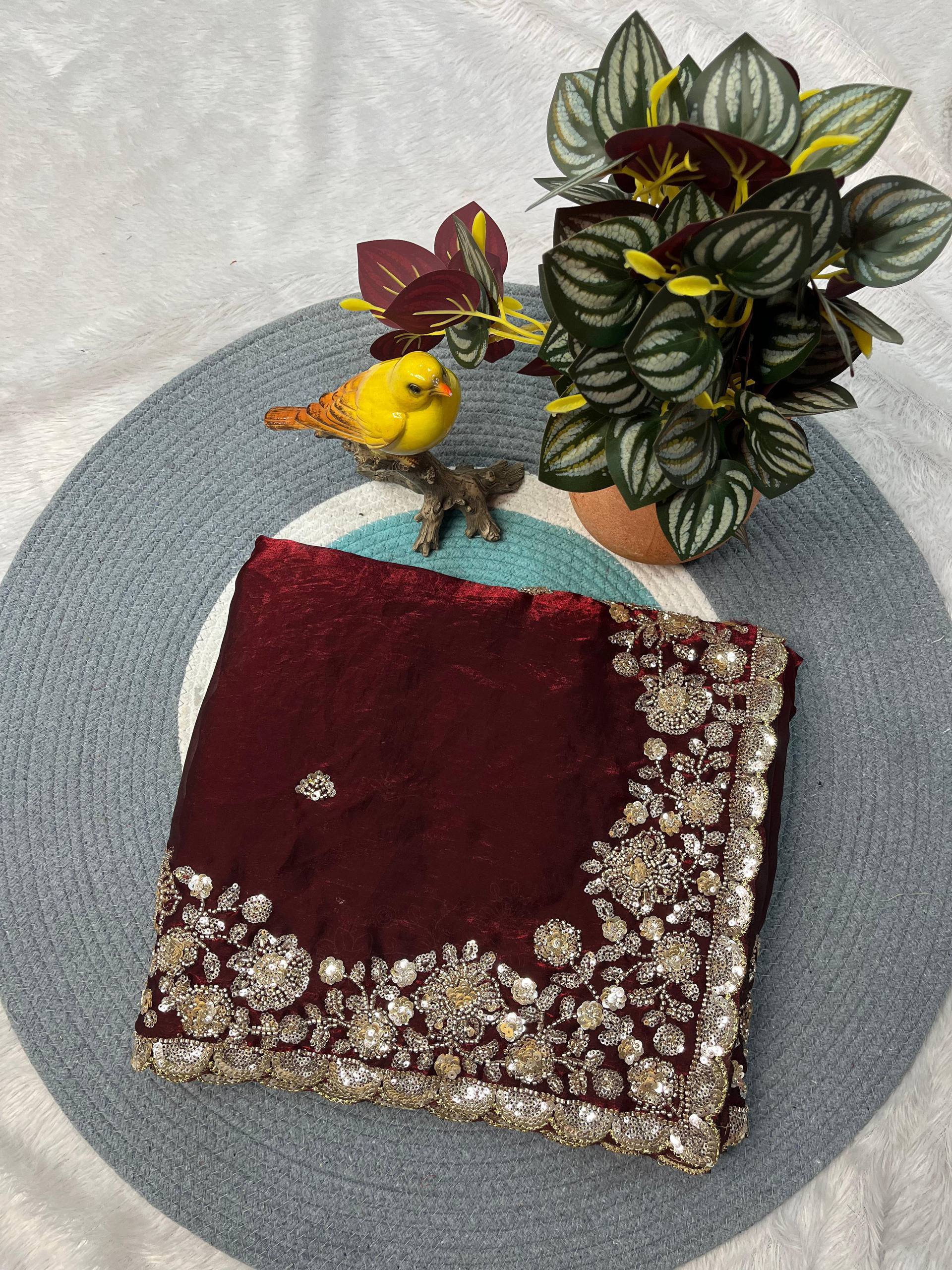 Maroon Gold Cutdana Beads, Sequins Embroidered Tissue Saree (SC55511)