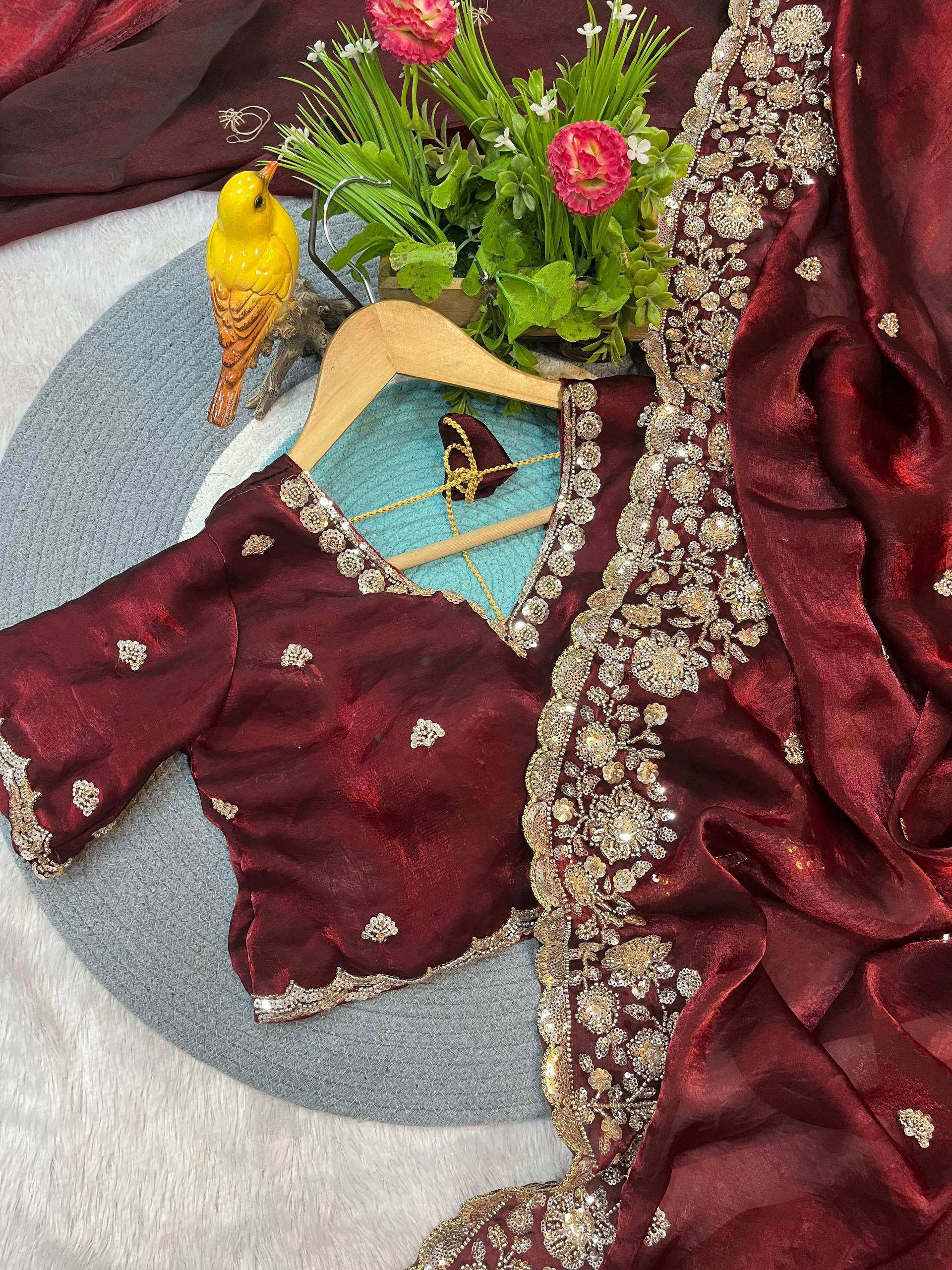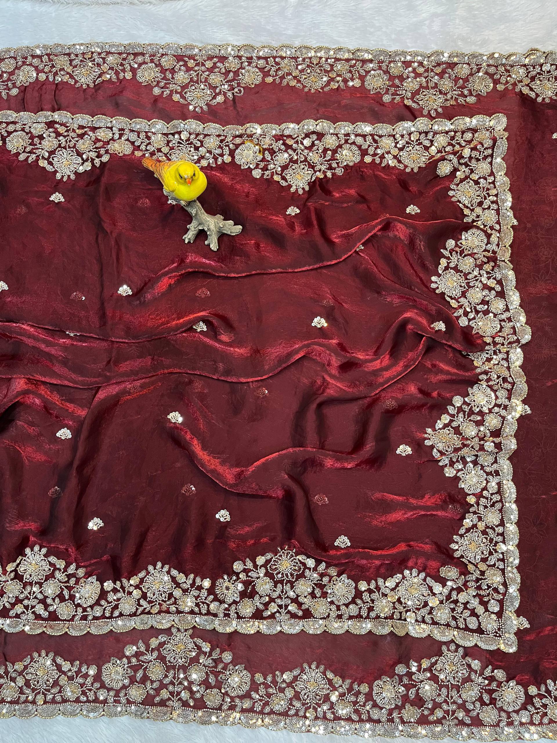 Maroon Zariwork & Sequins Embroidery Tissue Saree (SC35230)